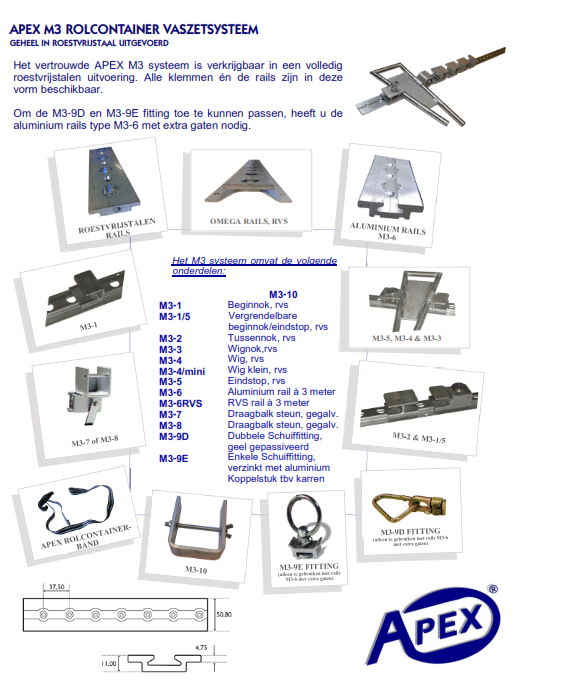 Wat het Apex systeem uniek maakt, is dat het zichzelf tijdens het rijden steeds vaster zet door de wig M3-4. De aluminium rail is licht van gewicht en heeft een steek van 30 mm, vervaardigd uit een hoogwaardige legering die ook in de vliegtuigindustrie wordt gebruikt, conform de normen DIN3.1255 (Duitsland), 2024 (USA) en A.U4G1 (Frankrijk). Daarnaast is de rail ook verkrijgbaar in RVS.