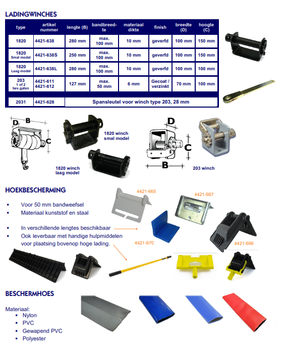 Onze hoekbeschermers bieden effectieve bescherming voor uw spanbanden tegen scherpe randen, wat helpt om schade en slijtage te voorkomen. Beschadigd bandweefsel is een belangrijke oorzaak van ladingverlies tijdens transport, dus de juiste bescherming is essentieel. Ze zijn verkrijgbaar in zowel kunststof als staal en geschikt voor alle maten bandweefsel.