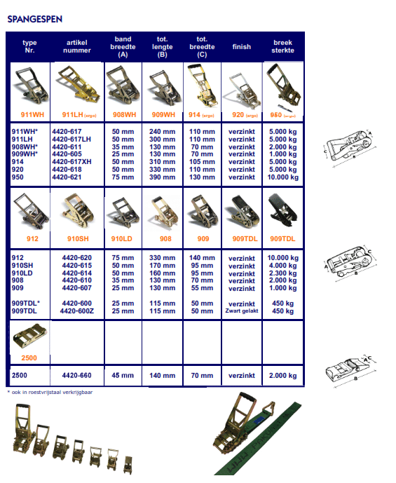 Bent u op zoek naar een specifieke spanband? Of het nu gaat om een spanband met een oog aan het eind, een kromme haak, of een variant volgens de norm met een beschermhoes, wij hebben het voor u! Ook voor naam- of logobedrukking, waarschuwingslabels, of ratels die “andersom” werken, kunt u bij ons terecht.