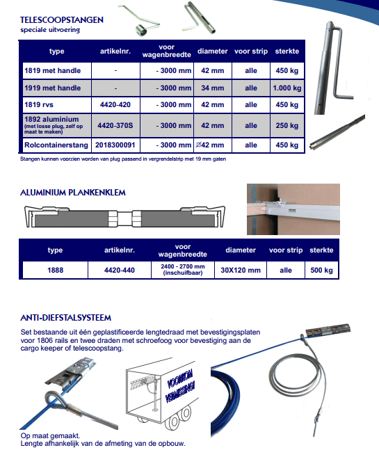 Naast onze standaard telescoopstangen bieden wij ook een breed scala aan speciale ladingvastzetstangen. Hieronder vindt u een aantal mogelijkheden die wij kunnen vervaardigen. Uiteraard staan wij klaar om u te helpen met al uw specifieke wensen en vereisten. Neem gerust contact met ons op voor meer informatie!